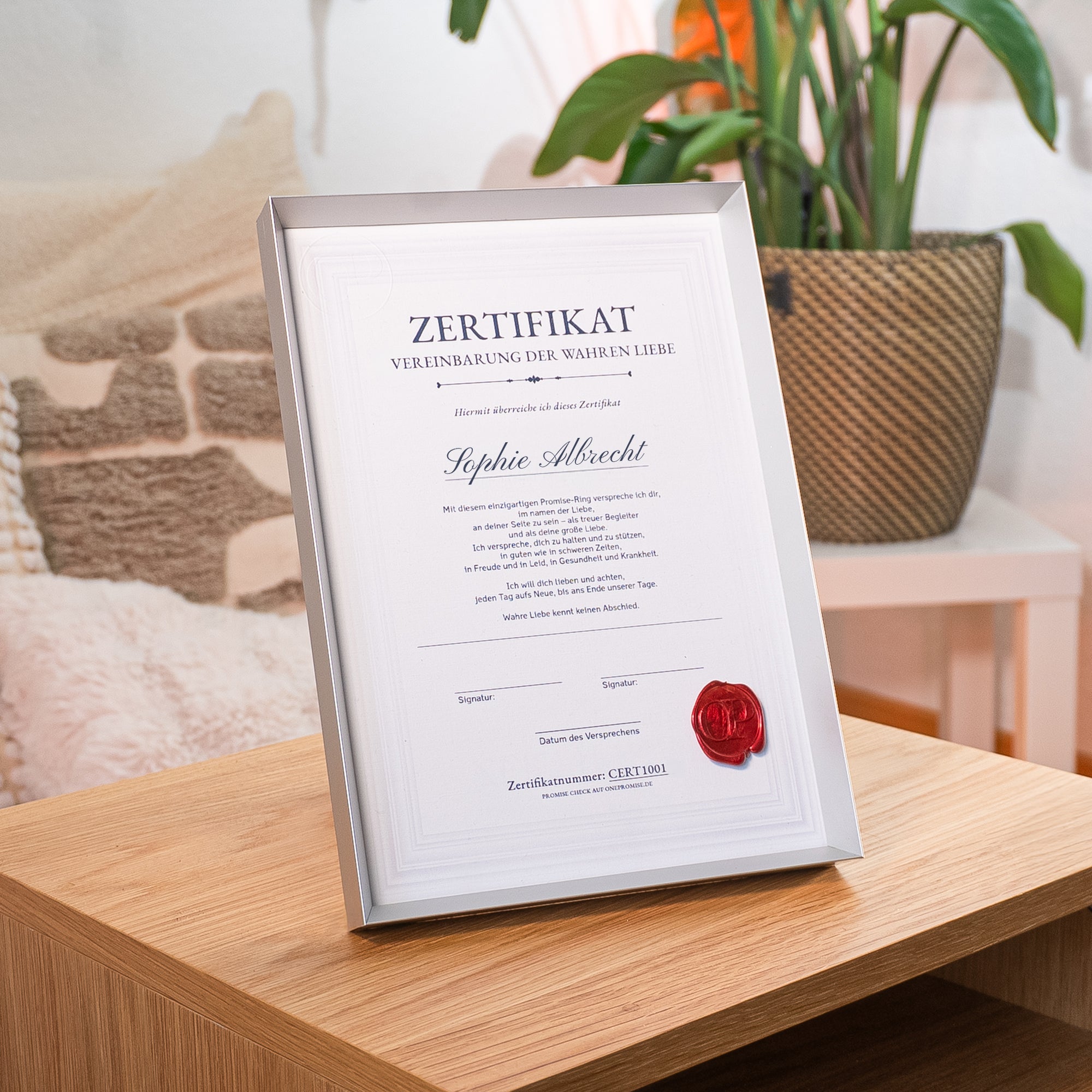 Präsentiere dein Promise-Zertifikat in einem eleganten Aluminiumrahmen, der die Bedeutung deines Versprechens unterstreicht. Mit seinem minimalistischen und hochwertigen Design sorgt dieser Rahmen dafür, dass dein Zertifikat perfekt in Szene gesetzt wird.